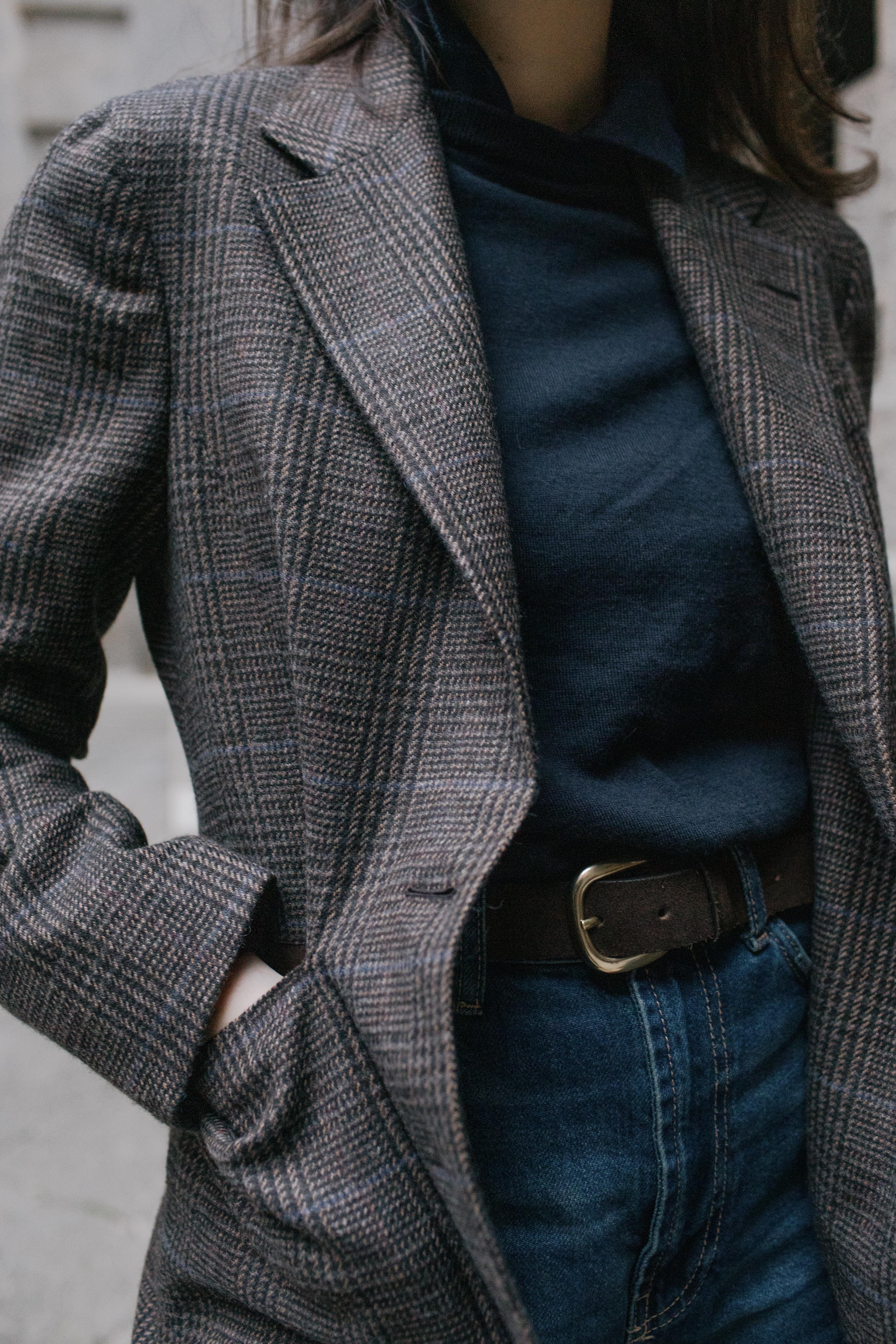 MTM Single Breasted Sports Jacket in AIT-147, Mockneck Lambswool Navy, AIC Denim One Wash, Brown Suede Belt, Unley Brown Suede Loafers