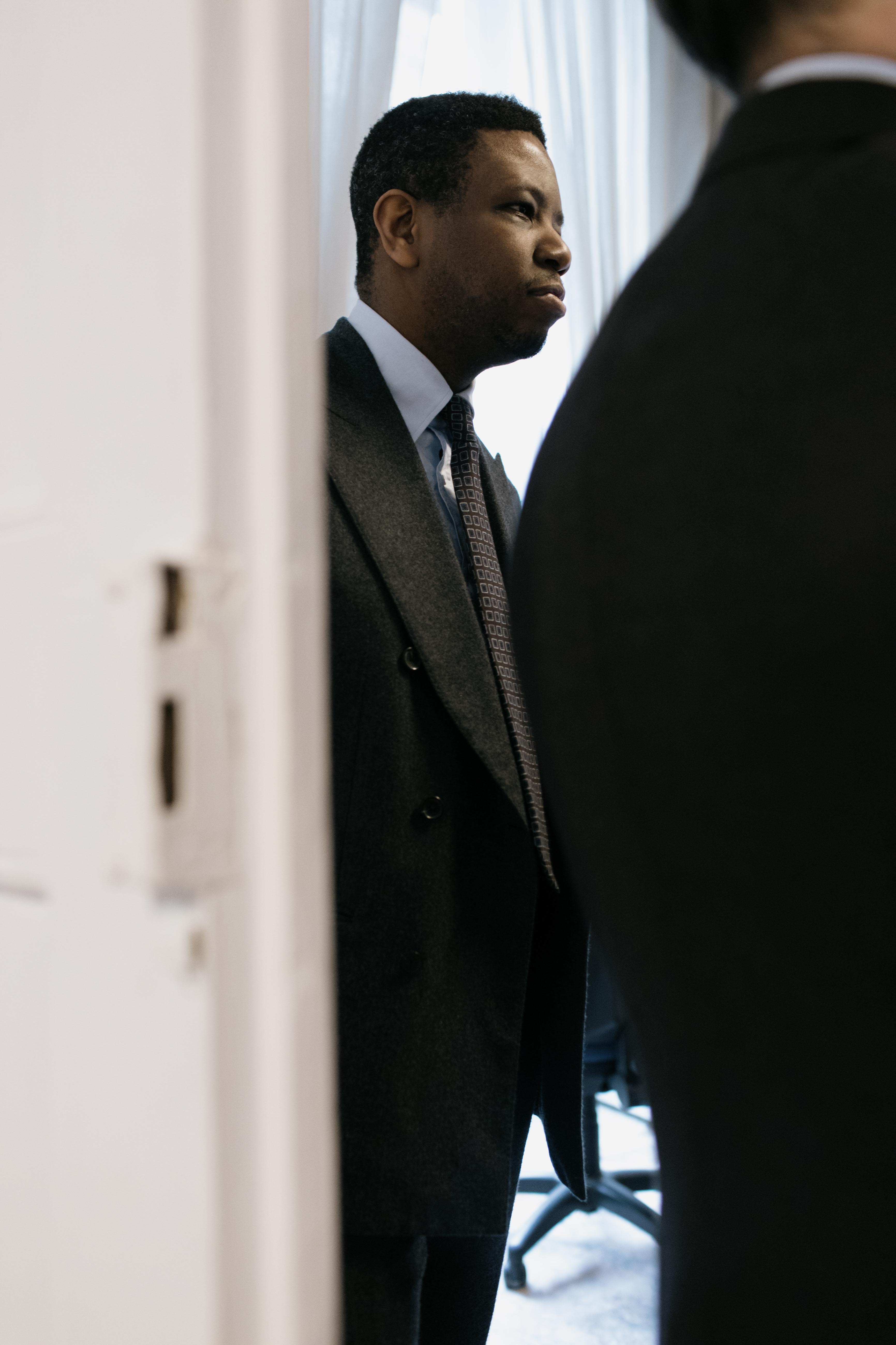 Grey Raglan Sleeve Overcoat, MTM Single Breasted Suit in AIT-045, Blue OCBD Shirt, Grey Glen Plaid Wool-Cashmere Tie