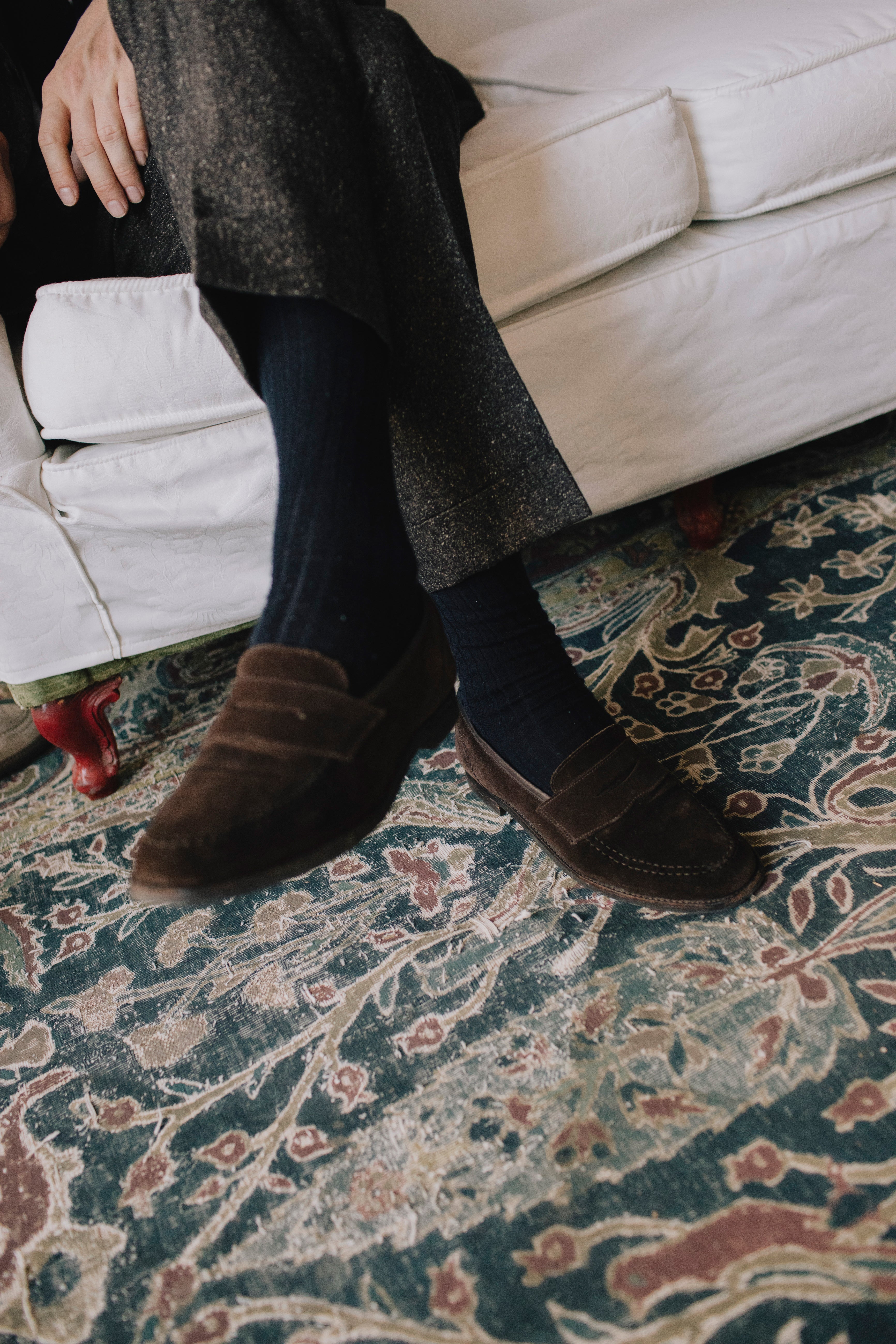 Wool Tweed Single Breasted Suit, Point Collar Shirt Bengal Mid-Blue Stripe, Grey Cashmere Tie, Unley Brown Suede Loafers