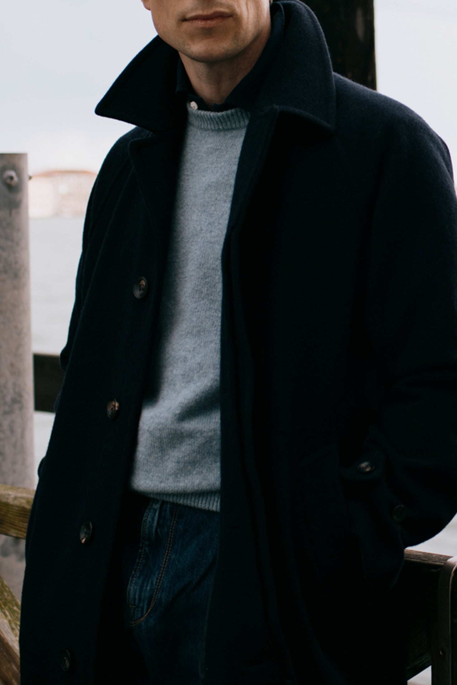 Charcoal Wool Double Breasted Martingala Coat, Sage Lambswool-Shetland Crewneck, Light Wash Denim Spread Collar Shirt