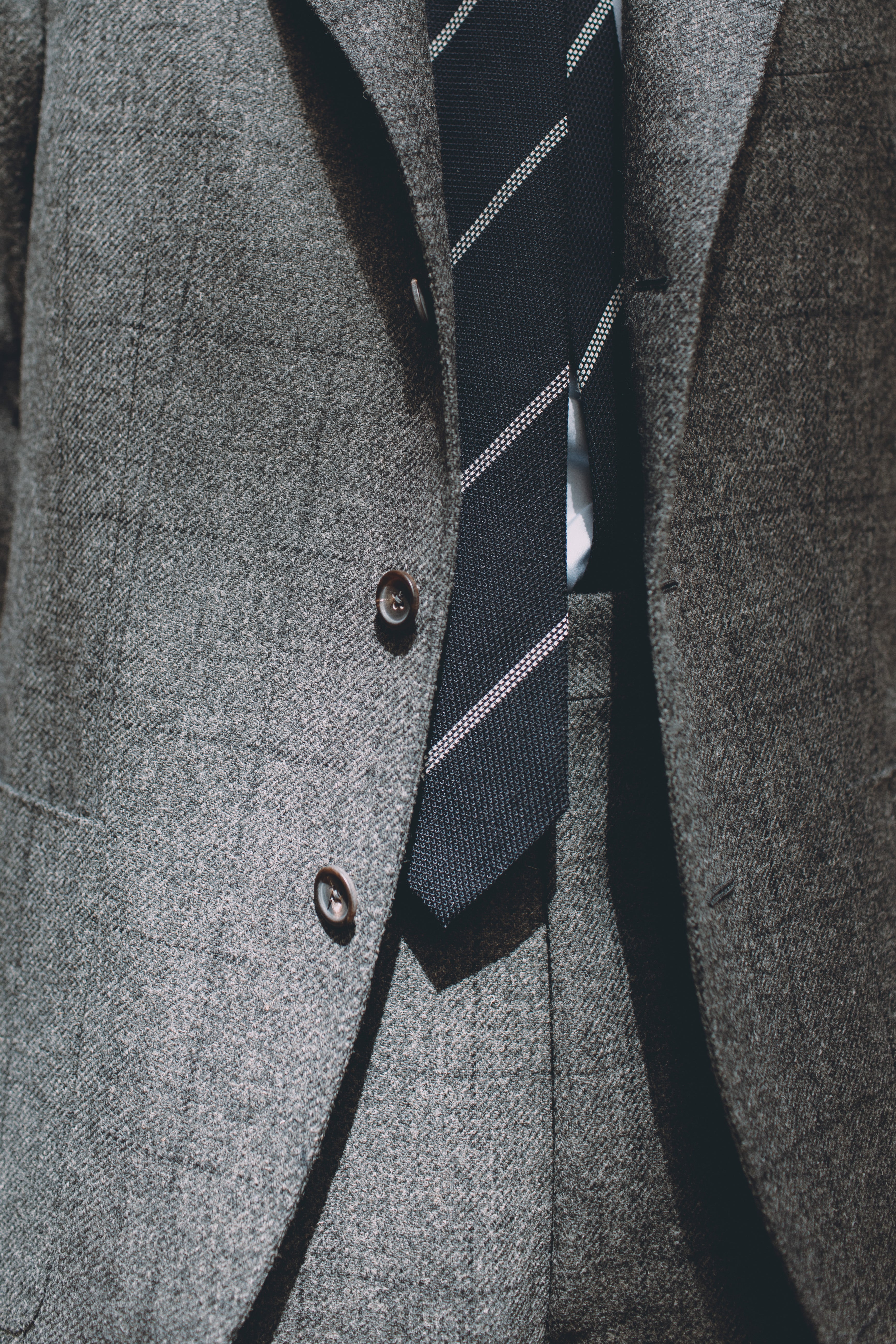 Grey Tweed Charcoal Overcheck Single Breasted Suit, Point Collar Shirt Cotton Poplin Sky Blue, Navy White Stripe Wool-Silk Grenadine Tie, Unley Brown Suede Loafers