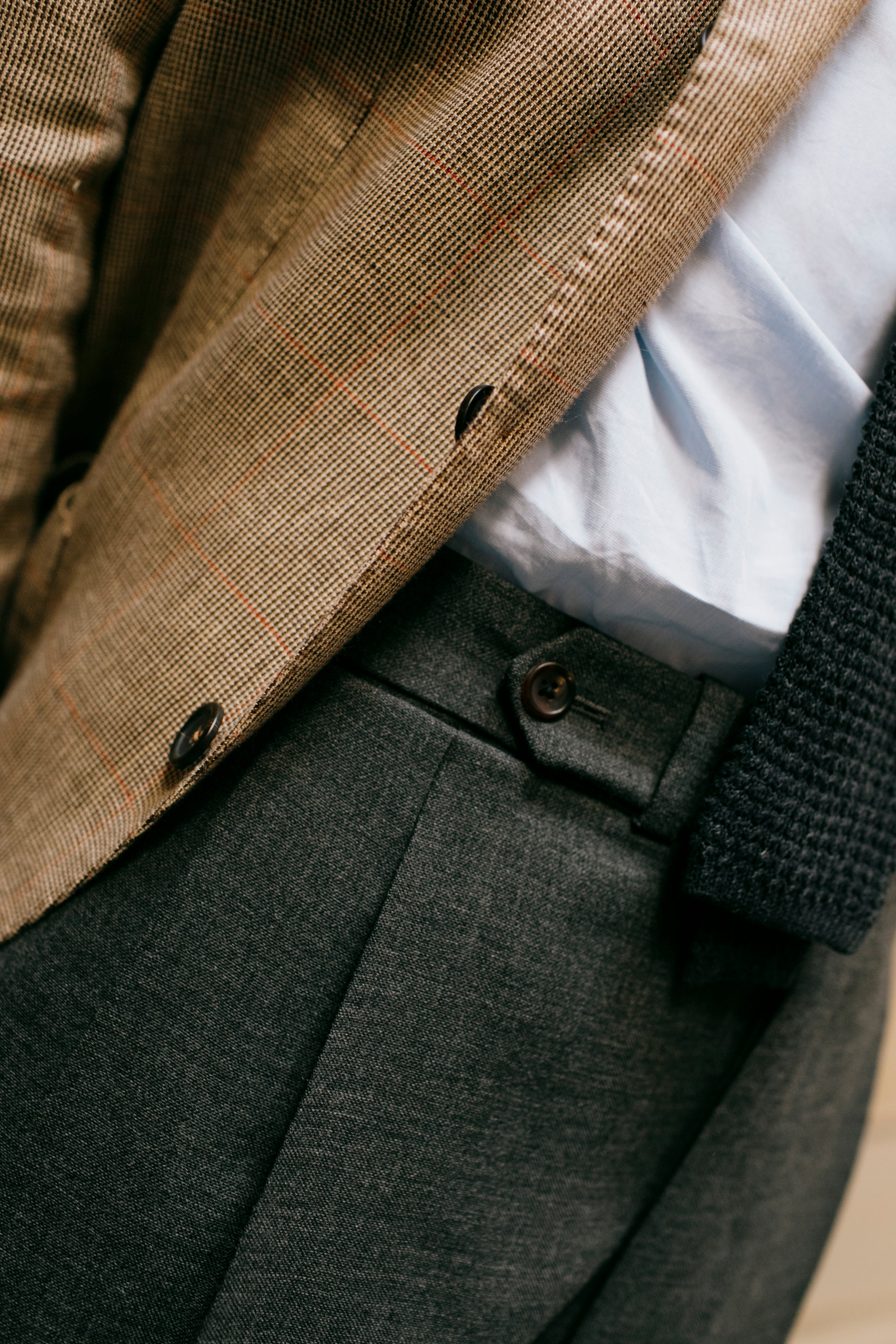 Our block has a single pleat, side tabs, mid-to-high rise and a gently tapered leg with plenty of inlay, left unfinished. We finish most of our trousers with a 5cm cuff, which helps the trouser drape nicely, keep a clean line and break correctly.